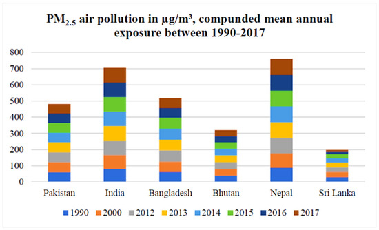 The air quality data trends of Pakistan, India, Nepal, Bangladesh, Bhutan, and Sri Lanka were analyzed. According to a careful analysis, the poor indoor air quality led to environmental, health, and sustainability issues in the South Asia countries [117]. In Pakistan, the mean annual exposure to PM2.5 was 58.3 µg/m3 (1990), which steadily increased to 60.34 µg/m3 in 2017. The mean annual exposure to PM2.5 in India was higher (81.3 µg/m3) in 1990, which was further increased (90.9 µg/m3) in 2017. Moreover, Nepal’s exposure to PM2.5 was highest among all countries (~99.7 µg/m3) in 2017 (Figure 6). Hence, it can be concluded that the pollution exposure situation in Pakistan was worse than Bhutan and Sri Lanka, however, it was a little better than India and Bangladesh. However, the IAQ monitoring and regulatory standards need to be adopted in Pakistan.