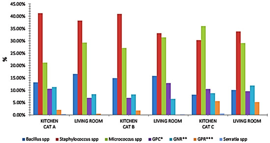 Microflora have been a major source of toxins in the indoor environments [136,137]. Sidra et al. [138] monitored the microflora and PM in thirty houses in Lahore. The occurrences of airborne microorganisms and PM2.5 were measured using the real time aerosol monitors (DustTrak model 8520; TSI Inc., Shoreview, MN, USA) in kitchens and living rooms. The temperature, relative humidity, and CO2 levels were documented using the Gas probe IAQ (BW technologies). The temperature measured during the monitoring was about 18–37.8 °C, in the kitchens and living rooms. The average relative humidity levels were found to be around 20–75% in the kitchens and living rooms. Figure 7 demonstrates the percentage of different bacterial species detected in the kitchens and living rooms of different houses in Lahore.