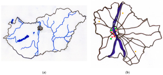 (a) Location of Budapest within country (striped area), (b) sampling locations (red dots—in Buda: Tabán, Buda Arboretum, Feneketlen pond, and Petőfi-bridge at Buda bridgehead; in Pest: Deák square), chosen HAQN’s measuring stations independent of our institute (green dots) for PM10 (Széna square north and Kosztolányi square south in Buda—left from the Danube—and Erzsébet square in Pest—right from the Danube), and meteorology station also independent of our institute (yellow dots) for precipitation and maximum wind speed (János hill in north Buda, Újpest in north Pest, and Lőrinc in south Pest) within Budapest [own editing].