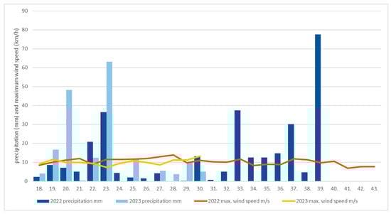 Weekly averaged maximum wind speed (m/s; brown line from 2022, yellow line from 2023) and precipitation (mm; dark blue column in 2022, light blue column in 2023) in Budapest (average of three measuring stations’ data: János hill—north Buda, Újpest and Lőrincz—north and south Pest). Data started from May (17th week of the year) and concluded in the end of October (43rd week of year (in 2023, data concluded in the 30th week of year, in end of July).