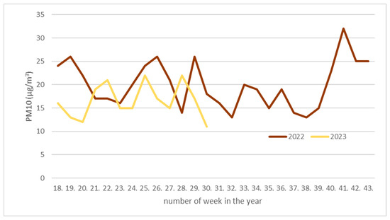 Weekly averaged PM10 (µg/m3; brown line from 2022, yellow line from 2023) in Budapest (average of three measuring stations data: Széna square—north Buda, Kosztolányi square—south Buda, and Erzsébet square—inner city in Pest). Data started from May (18th week of the year) and concluded in the end of October (43rd week of year; in 2023, data concluded in the 30th week of year, in end of July).