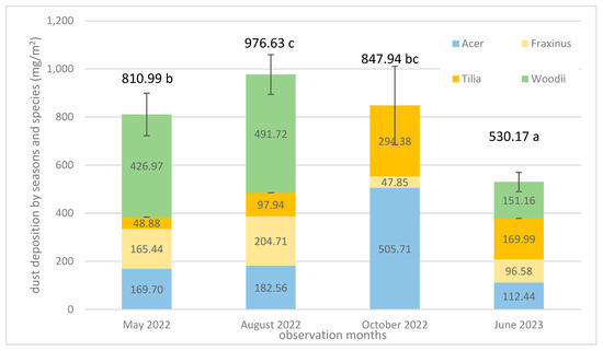 Investigating the average dust deposit (DDL) by species (Table 3), it can be seen that the leaves of ‘Woodii’ and Acer deposited the most dust from the air during the period under review. We have contradictory data regarding Tilia, of which its dust deposit was low in May and August, while it multiplied in October (Figure 4 and Table 3). The dust deposit capacity of the linden species varies between wide values.