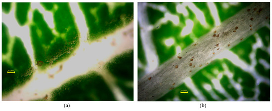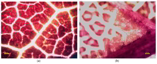 Figure 5, Figure 6, Figure 7 and Figure 8 present the microscopic images of the surface (a) and the back (b) of the leaves. Small, black dots on leaves are dust (please keep in mind that only a part of the measured quantities can be seen in these images at the 4× resolution; most of the measured dust is not visible at this magnification). Acer platanoides L. has a smooth and bright leaf surface according to [13], see Table 1. On the back of the leaf, there are short hairs on the veins. Fraxinus excelsior L. has a glabrous and shiny surface of compound leaves (Figure 6a) and there is not any hair. Tilia tomentosa Moench. leaves are full of trichomes, which look like stars (Figure 7a,b). We can observe dust particles trapped under the star hairs, especially on surfaces where small dust particulates are collected under starlike trichomes. Prunus cerasifera L. ‘Woodii’ is distinguished by the color of the leaf, on which it is difficult to observe the particulates of dust. The leaf surface is glabrous (Figure 8a), but on the backside, it is hairy in veins (Figure 8b).
