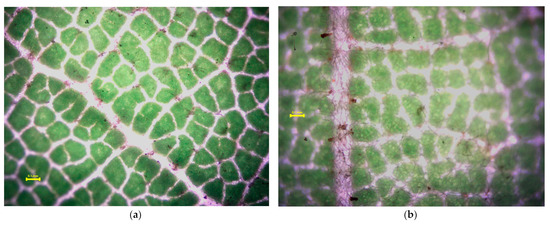 Stereomicroscopy images of the Prunus cerasifera L. ‘Woodii’ leaf surface (a) and backside (b). Yellow line in the picture means 0.1 mm scale. Small, black dots on leaves are dust (please keep in mind that only a part of the measured quantities can be seen in these images at the 4× resolution; most of the measured dust is not visible at this magnification).