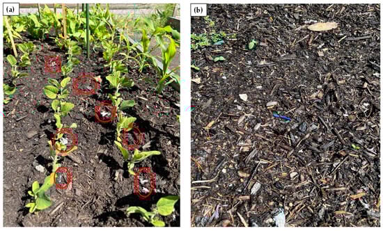 Garden soil (a) white plastic particles are noticeable on the surface of the garden, and (b) blue plastic particle visible along top of garden.