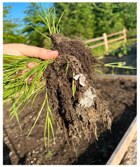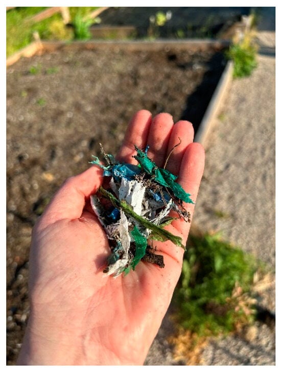 The problem of plastic contamination is most serious when composting facilities collect organic waste from private households. Figure 5 is a picture from the garden sample with plastics in the roots of plants. Due to the light weight, the difficulty of measuring, and the irregular shape, it is more common for contaminations to be reported in particles per kg in the scientific literature [,]. Because of this, the legislation around plastic contamination should be more specific to differentiate materials and to establish appropriate allowable concentrations. There is a research gap in the knowledge of a proper and standardized methodology that gives the exact concentration of MPs and NPs, and it is challenging to establish the minimum discard limits in solid samples.