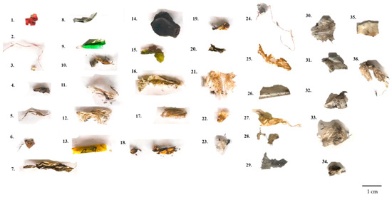 It was observed that the plastic pieces were varied in shape and color, some showed a fibrous habit (plastic numbers 3 and 23), and others were visually similar to the plastic used to make residential garbage bags, fruit bags, pieces of pen, and adhesive tape. For most of the particles, it was possible to identify their origin based on visual identification, for example, the plastic bags (plastics number 9, 13, and 21) and materials in some degree of decomposition (numbers 11, 12, 27, 29, and 35).