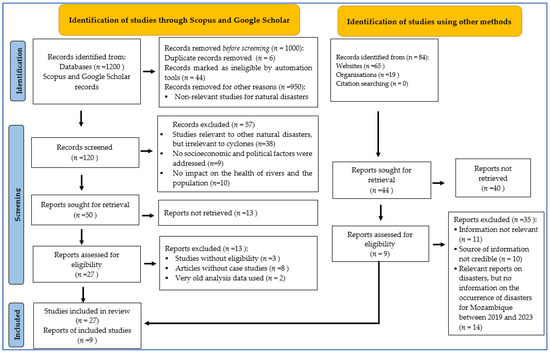 The literature review was primarily conducted using the Scopus interdisciplinary database, with an additional contribution from the Google Scholar database. The Scopus search used keywords (natural disaster) AND (“Mozambique”); (“Natural Disaster” OR “Cyclones”) AND (“Impacts on Mozambican Rivers”); (natural disaster) AND (“impacts in sub-Saharan Africa”); (“flooding in Mozambique”) AND (“health impact”). The Scopus articles included in the study were peer-reviewed and published in English between 2019 and 2023. The criteria also included human health impacts caused by flooding and social, economic or political factors. Articles on Google Scholar were searched using the keywords “Water pollution”, “flood”, “health” and “socio-economic and political factors”, and we selected articles published in English and also in Portuguese from 2019 to 2023. This resulted in around 1200 articles, reduced to 120 articles by screening titles and, finally, to 50 articles after screening abstracts. In total, 27 articles were reviewed to analyse the main impacts of floods on water quality at the basin level and health at the level of the central region of the country and to determine the regional distribution of these impacts on the water resources sector and health (Figure 2). Nine reports on the websites of the above-mentioned non-governmental organisations were also selected after screening.