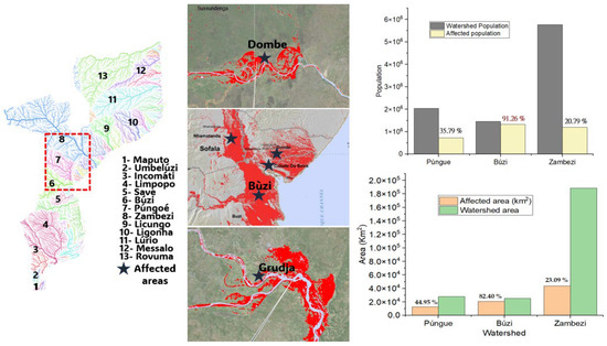 The flood assessment maps (Figure 3) are based on satellite analysis using pre- and post-disaster image data—in this case, images from before 15 March and from April 2019. The analysed area (76,907 km2) of the central zone—which includes parts of the Búzi, Púngue and Zambezi basins on a small scale, about 731,020 km2 (44.95%), 1,328,480 km2 (82.42%) and 1,198,658 (23.09%), respectively—was flooded, mainly for areas in the Búzi watershed. According to the population data for the localities in the Búzi watershed, around 91.26% of the people were potentially exposed to or lived in the flooded area. Furthermore, these people were dependent on the basin’s resources [21,39].
