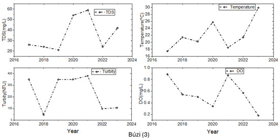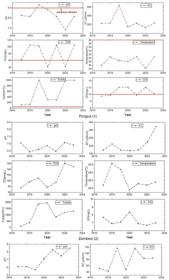 In terms of annual evolution (Figure 4), values above the maximum limit were recorded: DO in 2019, 2020 and 2023 for Púngue; Turbidity in 2019 to 2023 for the Púngue basin and in all years for Zambezi and Búzi; TDS in all years for Púngue (except 2022) and Zambezi. The other parameters (temperature, pH and EC) are in line with or close to the limits permitted by Mozambican regulations for this type of water.