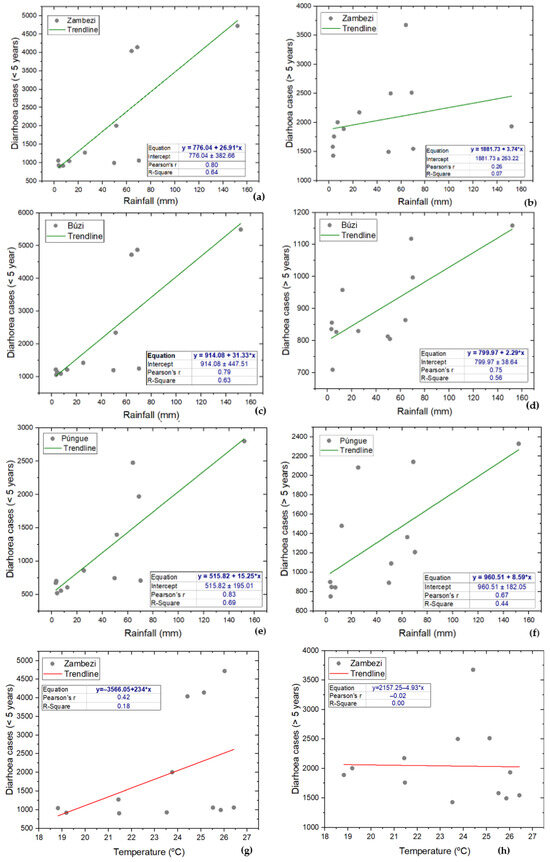 Correlation always requires the assumption of a linear relationship. Examining the correlations in Figure 5 for all statistics, PCC values for rainfall vary between 0.79 and 0.80 for diarrhoea cases for individuals under the age of 5, considerably higher than the correlations (0.26 to 0.75) for individuals over the age of 5. There is a highly linear degree of correlation for diarrhoea cases < 5 years and a weak–medium–strong correlation for diarrhoea cases > 5 years. Therefore, a large PCC implies that there is a large linear component of the relationship, which means that diarrhoea cases < 5 years are strongly influenced by water-related events. PCC for temperature ranges from 0.42 to 0.45 for diarrhoea cases < 5 years and falls between −0.02 and 0.38 for diarrhoea cases > 5 years. In this case, there is a medium correlation (diarrhoea cases < 5 years) and a weak or no correlation (diarrhoea cases > 5 years, Zambezi basin). A lower or zero correlation coefficient implies that the number of diarrhoea cases for >5 years is not strongly or not at all related to air temperature.