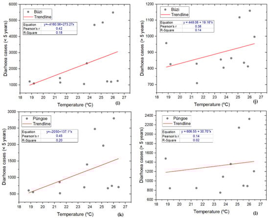 Relationship between diarrhoea cases and climate parameters: rainfall (a–f) and temperature (g–l).