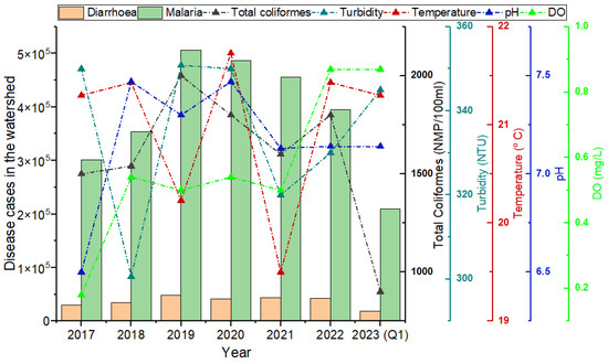 Figure 6 shows the correlation between water quality parameters and waterborne diseases for the Búzi watershed from 2017 to 2023. The increase in total coliforms contributed to the numbers in cases of diarrhoea between 2017 and 2018 (14.44%), 2018 and 2019 (28.98%) and 2020 and 2021 (5.76%). Between 2022 and 2023, there was an appreciable drop, with data only available for the first quarter of 2023, but comparing the quarterly data for the same year shows an increase of around 26%. The same holds for the malaria case profile, with a peak in 2019 and a 30.12% increase in cases compared to 2018. There is a relationship between the increase in turbidity and the increase in malaria and diarrhoea cases in 2019, and a contribution from temperature and pH to the increase in these diseases in 2018 and 2020.