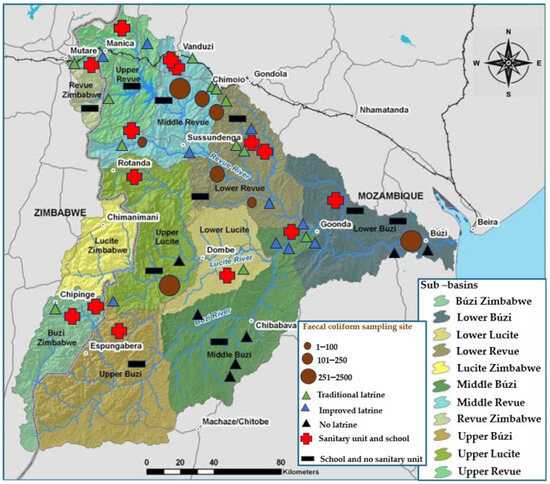 Using National Water and Sanitation Information System (SINAS) data [51], a map of the spatial distribution of total coliforms and WASH was created for the Búzi watershed (Figure 7). A total of 67 WASH element points were represented: sanitary units (14) with water points and schools (53) with traditional latrines (11) and improved latrines (15). However, there are schools without toilets (10) and, even worse, without latrines (7). Total coliforms with values above 251 (NMP/100 mL) are distributed throughout the sub-basin areas (upper Révué, lower Búzi and upper Lucite), the lowest being in lower Révué, with 90 NMP/100 mL.