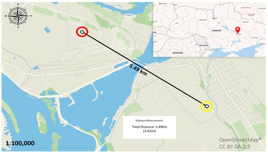 The concentrations of the metals (Cr, Zn, As, Cd, Pb, and Cu) in soil and Erigeron canadensis L. were studied at three research plots located at distances of 1.00 km, 5.5 km, and 12.02 km from the main sources of battery production and waste battery recycling facilities in Dnipro, Ukraine. Research plots 1 (P1-1.00 km) and 3 (P3-12.02 km) were presented in previous articles [52,53]. Figure 1 shows the location of the experimental plot 2.