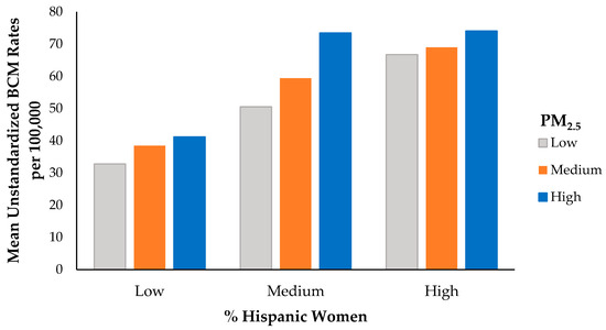 Figure 1 shows that BCM rates tend to increase with increasing levels of Hispanic concentrations in a community. Furthermore, the figure illustrates that BCM rates tend to positively increase with increasing levels of PM2.5 and the effect is attenuated among communities with high concentrations of Hispanic women. This indicates that across communities with a high concentration of Hispanic women, BCM rates are high despite varying levels of PM2.5.