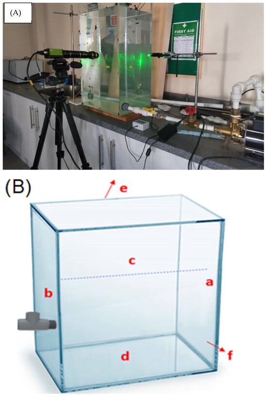 (A) Photograph of the experimental setup [18]. (B) Sampling points (marked as a—opposite to the main wall of the tank, b—wall fitted with venturi (main wall), c—surface, d—bottom, e—back wall, and f—front wall) from the glass tank.