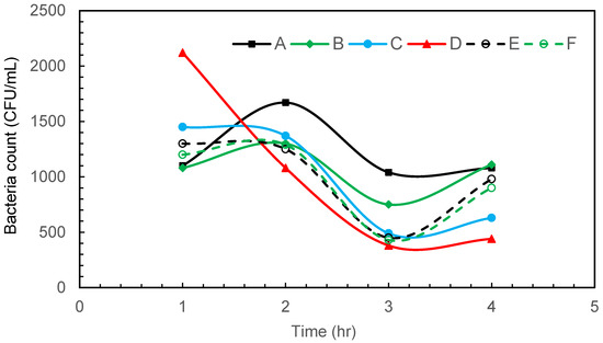 Within 6 h of intermittent microbubbling and cavitation, E. coli was effectively eliminated and a 95.65% reduction in bacterial count was achieved by the end of the treatment period, which is associated with a log reduction of 1.36. As reported by several other researchers, it is believed that disinfection or a reduction in bacteria occurs due to a synergistic combination of shear, oxidation, and heating effects. As a venturi-type microbubble generator is used in this study, the shrinkage rate of the collapsing bubbles is extremely slow and will not increase the temperature of the water. Due to pyrolytic decomposition that takes place within the collapsing bubbles, the OH radical and shock waves can be generated at the gas–liquid interface, which in turn is responsible for the oxidative cell damage of microbes [26,27]. In addition to this, the physical rupture of the cell is known to take place due to shock/waves generated by bubble collapse. The generation of highly reactive free radicals and turbulence associated with the collapsing MBs provides great potential for water disinfection.