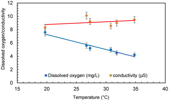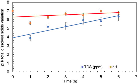 The temperature of the water was raised significantly throughout several treatments in the small amount of water (30 L) taken for the experimental procedure. The temperature of the water was raised from 20 ± 1 °C to 35 ± 1 °C during the 6 h of treatment. The pump of the microbubble generator generates a significant quantity of heat during operation, which is transferred to the water. However, due to the quick exchange of temperature between the water body and the surrounding air, this may not be a problem with large quantities of water. The increase in temperature has no effect on bacteria growth as it is within the range of the temperature for each bacteria growth. The range of temperature for Escherichia coli (E. coli) is 7–50 °C, Bacillus subtilis is 18–43 °C, and Deinococcus radiodurans is 20–42 °C. Dissolved oxygen first increased at the beginning of the experiment and then started decreasing as the treatment continued. Dissolved oxygen was 5.8 ± 0.5 mg/L in the beginning and increased to 7.6 ± 0.5 mg/L after 4 min of microbubbling. Then, the dissolved oxygen continued to decrease through the experiment. The conductivity of the water was found to increase during the treatment (seen in Figure 6), which can be due to the dispersion of the solids caused by microbubbling and to the increase in temperature of the bubbled water. Figure 7 presents the conductivity and the total dissolved solids. It can be observed that an increase in conductivity correlates well with the increase in total dissolved solids (TDS) presented in Figure 6. A similar trend was observed for TDS as reported by Hellar-Kihampa et al. [31]. On the other hand, the pH of the water did not change much before and after the microbubble treatment and was within the error limit of the experiment.
