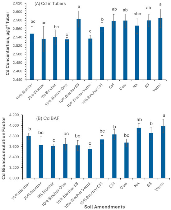 Figure 1A revealed that the concentration of Cd in potato tubers of plants grown in Vermi and SS amended with 10% Biochar was greater compared to CW and Vermi amended with 10% Biochar. The bioaccumulation factor (BAF) of potato tubers, obtained by dividing the concentration of Cd in tubers by Cd concentration in soil, was found to exceed 1 (BAF > 1) in all the treatments tested reaching a maximum of 3.9 and 3.8 µg g−1 tissue, in Vermi and NA, respectively (Figure 1B). The BAF value in tubers of plants grown in Vermi was significantly higher compared to those grown in Vermi amended with 10% Biochar. In addition, all the treatments investigated successfully accumulated Cd in the tubers, with the most significant accumulation in plants grown in Vermi-amended soil. This observation proved that potato tubers can remediate soil contaminated with Cd. Accordingly, potatoes grown in such amendments are not edible and should be considered hazardous waste due to their higher concentrations of Cd. However, these findings have significant implications for the reclamation of soil contaminated with Cd.