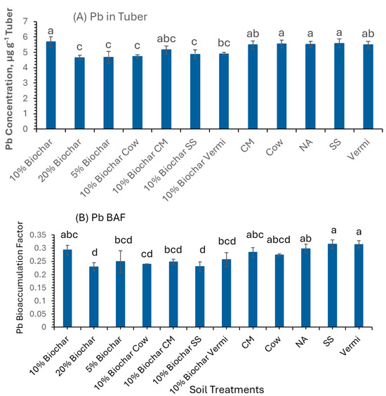 Figure 2A also revealed that the concentrations of Pb in potatoes grown under the studied soil amendments dramatically exceeded the FDA/WHO allowable limit of 1 µg g−1 for Pb (Table 3) in potato tubers at harvest. Significant concentrations of Pb were detected in the potato tubers grown in 10% Biochar, Cow, NA, and SS (5.7, 5.6, 5.5, and 5.6 µg g−1 tissue, respectively). On the contrary, mixtures of 20%, 5%, and 10% Biochar mixed with SS had the lowest concentrations of Pb. These results indicate that even NA is contaminated with Pb. Pb is the most common heavy metal and is resistant to corrosion. Food can be contaminated by naturally occurring Pb in the soil and by atmospheric fallout. However, the BAF of Pb in all tested tubers collected from the twelve soil treatments was below 1 (BAF < 1), reaching a maximum of 0.31 and 0.32 µg g−1 tissue in Vermi and SS, respectively (Figure 2B). The low BAF values of Pb in tubers grown in NA and soils amended with animal manure and Biochar treatments at three application rates indicate that Pb is not mobile from soil to potato tubers, a significant advantage for human safety.