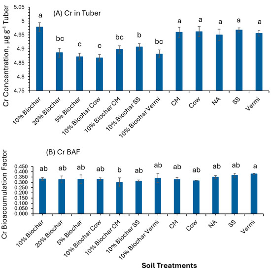 The Cr levels in potato tubers surpassed the maximum allowable limit of 0.1 µg g−1 (Table 3). As depicted in Figure 3A, potato tubers from plants cultivated in various treatments including 10% Biochar, a mix of 10% Biochar with Cow, CM, Cow alone, NA, SS, and Vermi showed significantly elevated (p ≤ 0.05) Cr concentrations (4.97, 4.8, 4.95, 4.96, 4.95, 4.96, and 4.95 µg g−1, respectively) compared to those grown with 5% Biochar (4.87 µg g−1) and 10% Biochar mixed with SS (4.90 µg g−1). Furthermore, the Cr bioaccumulation factor (BAF) in Vermi was significantly greater (p ≤ 0.05) than in the 10% Biochar combined with CM (Figure 3B). All BAF values for Cr were below 1, indicating that potato tubers do not accumulate chromium. Cr does not play a biological role in plant physiological processes [44], and elevated soil concentrations of Cr can hinder the uptake of essential nutrients like Fe, Mg, Ca, and P by forming insoluble complexes [45].