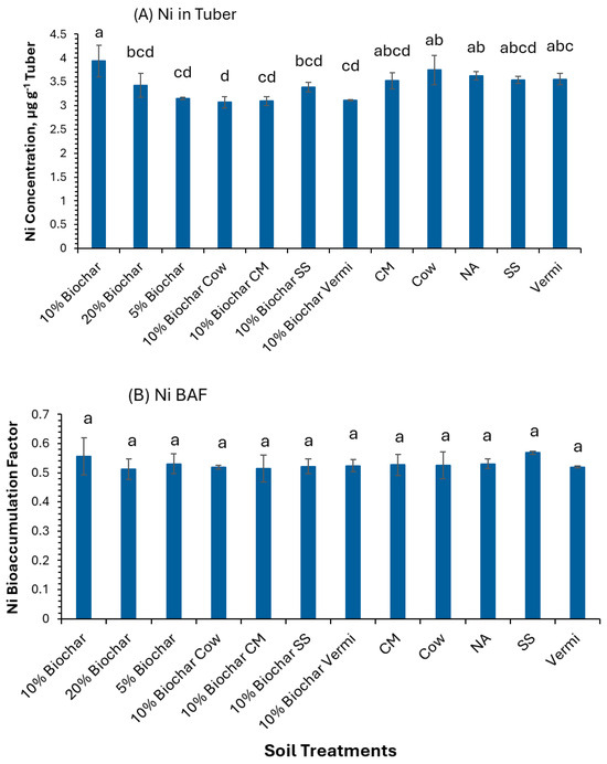 Concentration of Ni in potato tubers grown under twelve soil management practices (A) and Ni bioaccumulation factors (B). Statistical analysis was carried out among the soil treatments using analysis of variance (ANOVA). Values accompanied by a different letter(s) are significantly different (p ≤ 0.05) using Duncan’s multiple tests for mean comparisons.