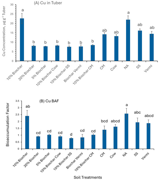 Figure 6A shows that potato plants grown in 10% Biochar (22.5 µg g−1) and NA (21.91 µg g−1) had significantly greater (p< 0.05) concentrations of Cu in their tubers compared to tubers of plants grown in 20% Biochar, 5% Biochar, 10% Biochar mixed with Cow, 10% Biochar mixed with SS, 10% Biochar mixed CM and 10% biochar mixed with Vermi (7.97, 7.75, 8.1, 7.5, 8.35, and 7.6 µg g−1 tissue, respectively). The BAF values of Cu in tubers grown in the NM control and 10% Biochar treatments show a BAF > 1 that is significantly greater than (p < 0.05) compared to tubers of plants grown in 20% Biochar, 5% Biochar, 10% Biochar mixed with Cow, 10% Biochar mixed with SS, 10% Biochar mixed CM, 10% Biochar mixed with Vermi and CM (Figure 6B). These high (>1) BAF values indicate that potato tubers of plants grown in the twelve treatments are Cu accumulators.