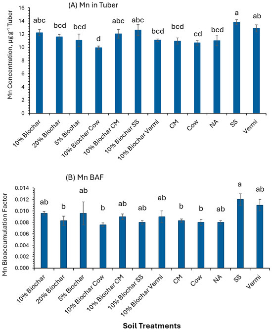 Figure 7A also shows that soil amended with SS (13.8 µg g−1) had a significantly higher (p ≤ 0.05) Mn concentration in potato tubers than 20% Biochar, 5% Biochar, 10% Biochar mixed with Cow, 10% Biochar mixed with Vermi, CM, Cow, and NA (11.62, 11.07, 9.95, 11.09, 10.96, 10.68, and 11.03 µg g−1 tissue, respectively). In addition, the BAF value of Mn in all the soil treatments investigated was below 1 (BAF < 1) (Figure 7B). Soil amended with SS had significantly greater (p ≤ 0.05) BAF than the other treatments. These Mn BAF values indicate that potato tubers are not Mn accumulators. Mn is both a heavy metal and an essential micronutrient. It is a part of photosynthetic enzymes and proteins in plants [47].