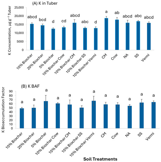 Concentrations of K in potato tubers grown under twelve soil management practices (A) and K bioaccumulation factors (B). Statistical analysis was carried out among the soil treatments using analysis of variance (ANOVA). Values accompanied by a different letter(s) are significantly different (p ≤ 0.05) using Duncan’s multiple tests for mean comparisons.