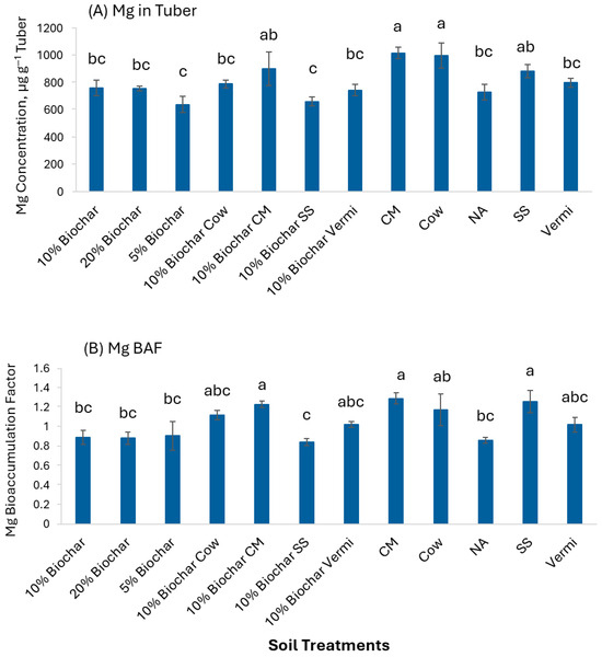 Concentration of Mg in potato tubers grown under twelve soil management practices (A) and Mg bioaccumulation factors (B). Statistical analysis was carried out among the soil treatments using analysis of variance (ANOVA). Values accompanied by a different letter(s) are significantly different (p ≤ 0.05) using Duncan’s multiple tests for mean comparisons.