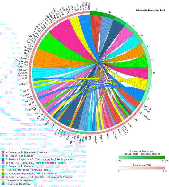 There were 2237 differentially expressed (DE) genes used in the analysis that are known to be altered by Pb based on CTD, and enrichment was performed against all the genes in the Advaita Knowledge Base (AKB). The analysis revealed a significant number of pathways (Figure 1) perturbed by Pb exposure depicted in the chord diagram. According to pathway enrichment analysis, Pb impacts processes such as response to estradiol, positive regulation of transcription by RNA polymerase II, and cellular response to amyloid-beta, all of which are important to reproductive processes. Regarding the enrichment of the response to estradiol, brain-derived neurotrophic factor (BDNF) was upregulated and, though well-known for its neuronal association, BDNF is expressed in ovarian tissue and contributes to follicle and embryonic development, as well as oocyte maturation [66]. One previous study completed on embryonic Pb-exposed zebrafish noted noticeable behavioral impairments in larvae, which were associated with BDNF disruption; however, gene expression analysis revealed reduced levels of bdnf [67]. To date, no studies report on BDNF-associated disruption in livestock; however, various studies report its alterations following Pb exposure in rats [68,69] and humans [70]. Regarding the enrichment of the positive regulation of transcription by RNA polymerase II and cellular response to amyloid-beta, along with the upregulation of BCL2 and CASP3, respectively, these results imply impacted roles in reproductive homeostasis [71]. The enrichment of estrogen early response pathways and upregulation of nfkbil1 (NFKB inhibitor-like 1) suggest potential estrogen receptor (ER)-mediated effects.