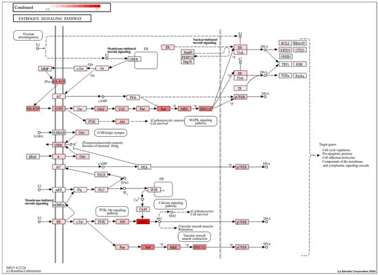 Figure 2 depicts an estrogen signaling pathway perturbed by Pb exposure based on molecular data. Red color indicates that the transcript has been identified in transcriptome or proteome studies to be altered by Pb based on the Comparative Toxicogenomics Database. BCL2, AKT, ERK1/2, CREB, and eNOS, which were all upregulated in our analysis, play important roles in follicular development, oocyte maturation, and uterine receptivity. Similar dysregulation has not been reported in much literature, specifically in livestock; however, experimental fish studies do elaborate on similar transcript alteration due to Pb toxicity [72,73,74]. Pb may dysregulate BCL2, which may inhibit follicular atresia [75] and Pb can inhibit AKT signaling and disturb ERK1/2 activation, leading to impaired GC function and disrupted steroidogenesis [76]. Dysregulation of CREB and eNOS further compromises uterine gene expression and vascular function, affecting implantation, and placental development [77]. Collectively, these molecular disruptions highlight Pb’s potential to impair fertility through estrogen-mediated signaling.