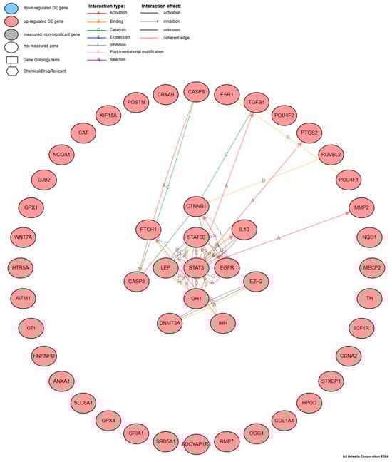 Figure 3 depicts an upregulated estrogen-responsive gene network following Pb exposure. Within the center are key signaling molecules (i.e., EGFR, GH1, STAT3) involved in signal transduction pathways. Various genes within the network are both estrogen- and reproductive-related. For example, MMP2 (Matrix Metallopeptidase 2) is involved in the breakdown of the extracellular matrix, contributing to endometrial remodeling, implantation, and spermatogenesis [78]. ESR1 (Estrogen Receptor 1) mediates physiological responses to estrogen (i.e., follicle development, ovulation, and sperm maturation), in which its deficiency has been shown to contribute to infertility in animal models [79]. Additionally, TGFB1 (Transforming Growth Factor Beta 1), which is shown to interact with ESR1, is involved in tissue remodeling required for implantation, fertilization, spermatogenesis, angiogenesis, and inflammatory modulation [80,81].