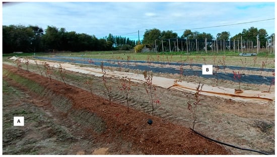 In June 2023, soil samples were collected in triplicate from unmanaged soil (Figure 1, site A). Additional soil samples were collected 14 months later, in August 2024, also in triplicate, from a soil covered with a black geotextile fabric material (polypropylene, PP) and cultivated with blueberries (Figure 1, site B). All soil samples were taken using a metallic soil corer from a depth of 0–20 cm. They were stored in glass containers, carefully handled to prevent airborne contamination and labeled for further analysis in the laboratory for MP particles using the adapted Method 2 (30% H2O2 digestion at 50 °C, for 48 h).