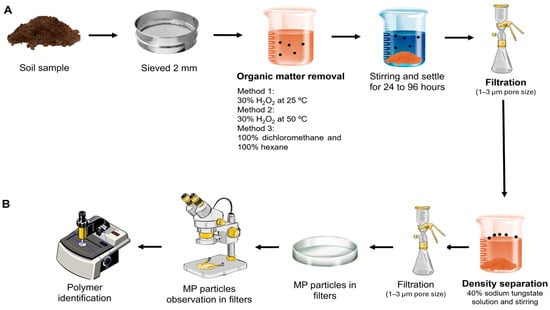 In the present study, three different methods were compared to evaluate the efficiency in removing the soil organic matter (Table 1, Figure 2A). The soil samples collected from the field were air-dried until constant weight and sieved through a 2 mm mesh to remove larger particles. Each soil sample was prepared in triplicate in the laboratory to ensure reproducibility. According to [2,24,25], agricultural soil samples should be sieved at <2 mm, and weight less than 50 g, preferably 5–10 g for MP determination.