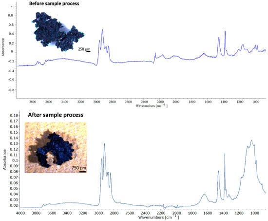 FTIR spectra showing: (up) the pristine polypropylene (PP) microplastic, and (down) the PP microplastic recovered after organic matter digestion, and the respective polymer (PP) identification by an ATR-FTIR spectrometer.