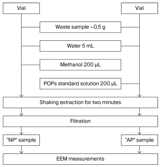 Figure 1 shows the pretreatment flow. To the waste sample (0.5 g), 200 µL of a 1 ppm mixture of eight POP standard solutions was added. This is referred to as the “Added POPs” sample, abbreviated as AP. Furthermore, 200 µL of methanol (the solvent of the POP standard solutions) was added to the sample that contained no POPs (referred to as the “No added POPs” sample, abbreviated as NP). Subsequently, 200 µL of methanol was added to the sample with NP. Then, 5 mL of purified water was added as the extraction solvent, and the sample was shaken for two minutes. The suspension was then allowed to settle and filtered using ADVANTEC circular filter paper No. 2. Any remaining suspended solids were filtered out using a PTFE membrane filter (0.25 µm).