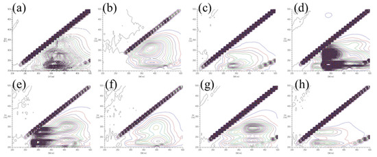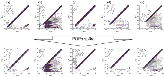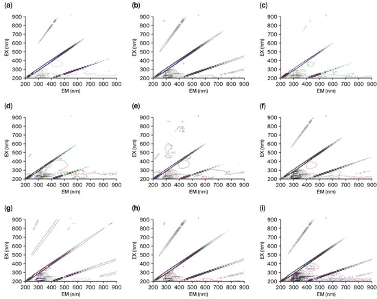 The EEMs of a mixture solution of eight POPs dissolved in methanol are displayed in Figure 4i. The fluorescence peak of the POPs is observed in the wavelength region from 300 to 400 nm when excited at 250 nm. Representative examples of EEMs with and without POPs are shown in Figure 5. The contour intervals reveal a greater fluorescence intensity in the absence of POP addition in comparison the samples with POPs.