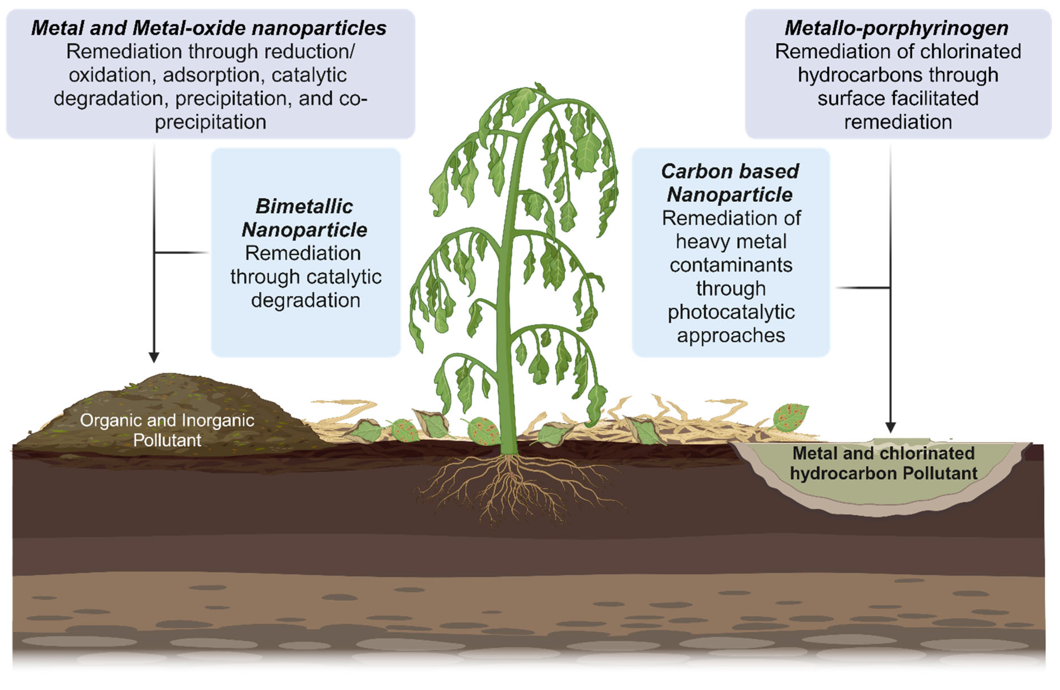 - Dhanapal, A.R.; Thiruvengadam, M.; Vairavanathan, J.; Venkidasamy, B.; Easwaran, M.; Ghorbanpour, M. Nanotechnology Approaches for the Remediation of Agricultural Polluted Soils. ACS Omega 2024, 9, 13522–13533. [Google Scholar] [CrossRef]