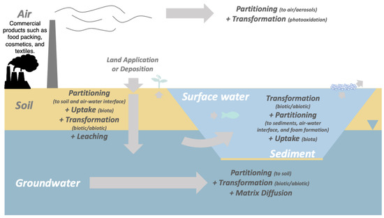 PFASs exhibit complex behavior in soils that critically shapes their fate across environmental compartments. Soils act as major reservoirs for PFASs, with their retention and mobility governed by factors such as PFAS chain length, functional groups, soil organic matter, pH, and cation content. Longer-chain PFASs tend to sorb more strongly to soils, leading to prolonged residence times and potential for slow leaching to groundwater, while shorter-chain PFASs are more mobile and can migrate more readily to water bodies or be taken up by plants [75,169,170]. PFASs can enter soils via atmospheric deposition, contaminated water, or biosolids, and once present, they may be transferred to plants, enter terrestrial food webs, or leach into surface and groundwater, contributing to widespread environmental distribution and human exposure [75,171]. Interactions at air–water and solid–water interfaces, as well as with dissolved organic matter and co-contaminants, further influence PFAS partitioning and transport between soil, water, and air [172,173]. Soil thus serves not only as a sink but also as a long-term source, slowly releasing PFASs to other compartments and sustaining contamination cycles. The persistence, bioaccumulation, and potential for transformation or degradation of PFASs in soils and other media underscore the need for integrated, multi-compartmental approaches to understanding and managing their environmental fate [73,169,170,171].