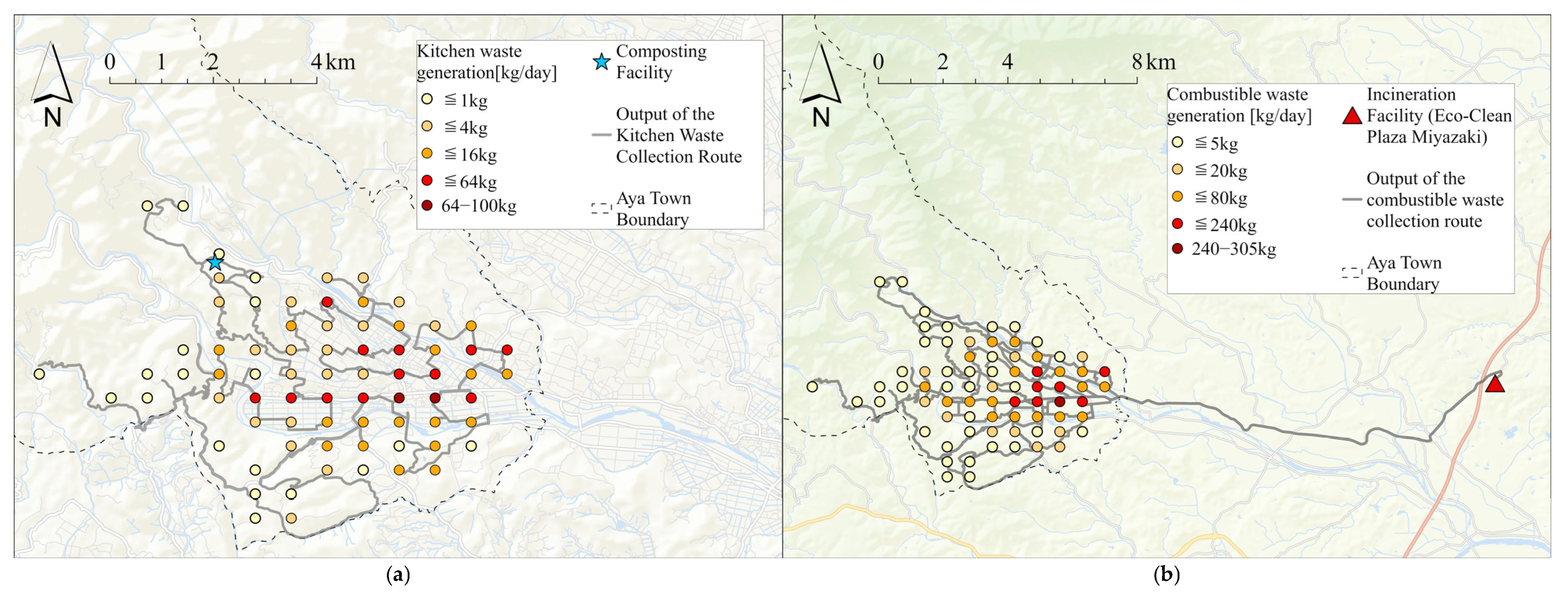 The VRP analysis incorporated vehicle loading constraints. Kitchen waste trucks were assumed to depart from the composting facility with an effective loading capacity of 1.92 tons per trip, while combustible waste trucks departed from the Eco-Clean Plaza Miyazaki incineration facility with a loading capacity of 1.5 tons. In both cases, once the truck reached its full capacity, it returned to the corresponding facility before starting the next route.
