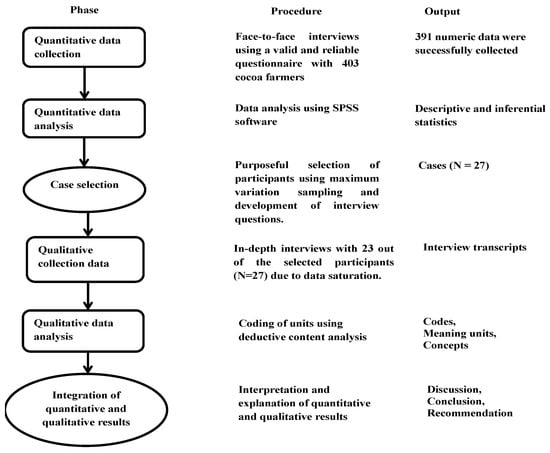The quantitative and qualitative sample sizes and data collection procedures followed those previously applied in related studies [20,21]. A cross-sectional design was used for the quantitative phase, while semi-structured, in-depth interviews were undertaken in the qualitative phase. In total, 391 cocoa farmers participated in the survey, and 23 farmers were interviewed.