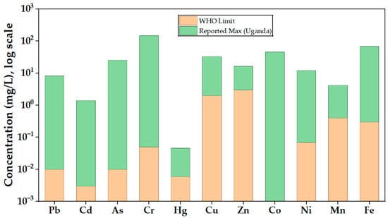 Reported maxima concentrations of PTEs in Ugandan potable and drinking water sources (2000–2025) compared with the WHO drinking water guideline limits. Concentrations are represented on a logarithmic (base-10) scale to accommodate the wide range of reported values spanning several orders of magnitude.