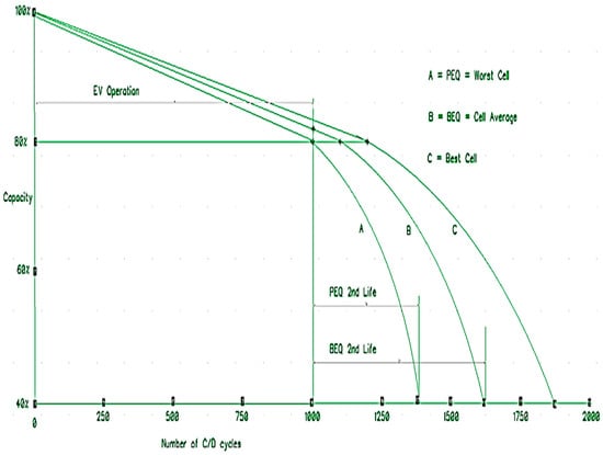Figure 1 assumes the EV battery reaches 80% capacity after 1000 charge/discharge (C/D) cycles. The battery is then removed from the EV, reconditioned, and begins its second life. If it uses a PEQ during its second life between the original 80% and 40% capacity values, it will continue to follow plot A until it reaches the original 1375 cycle value. This provides an SL lifetime of only 1375 − 1000 = 375 cycles. However, if the PEQ is replaced with a BEQ, second life follows plot B and ends at 1610 cycles. This provides a lifetime of 1610 − 1000 = 610 cycles, an increase of about 60% more than the PEQ. A similar analysis was done using the two horizontal dashed lines in