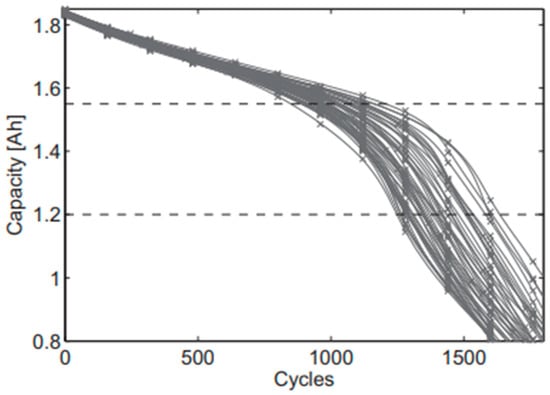 2] shows actual experimental plots for 48 nickel manganese cobalt (NMC) cells tested in a laboratory setting. These data show that the divergence in cell capacities becomes quite large in the nonlinear, i.e., SL, region. Additional analyses of cell capacity decrease caused by age and/or usage are provided in [