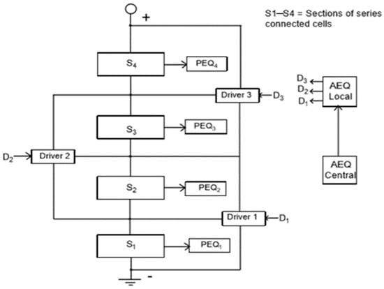 The BEQ is an AEQ/PEQ hybrid that operates at two different voltage levels, thus the term, bilevel. To implement a BEQ, the battery is divided into individual sections, each with a few series connected cells, as shown by the block diagram in