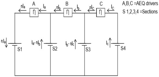 The four sections, S1–S4, have the following capacities: AH1 = 30 Ah, AH2 = AH3 = 45 Ah and AH4 = 60 Ah. Three AEQ drivers, A, B and C, like those in