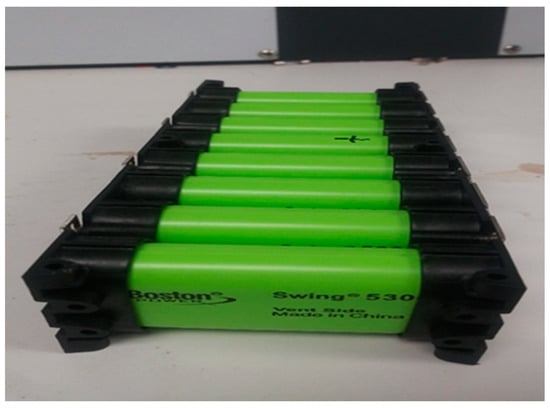 A BEQ lab prototype was developed and tested with a cobalt oxide Li-ion battery with 24S-8P cells, i.e., there were 24S modules, each with 8P cells. Each “cell” of this battery is actually a module consisting of eight Boston Power Swing 5300 cobalt oxide cells connected in parallel. Each of these cells will now be referred to as blocks, and each has a manufacturer’s C/5 rated capacity of 5 Ah each. These blocks were about 3 or 4 years old and had experienced numerous charge/discharge cycles. A typical cell with 8P blocks is shown in