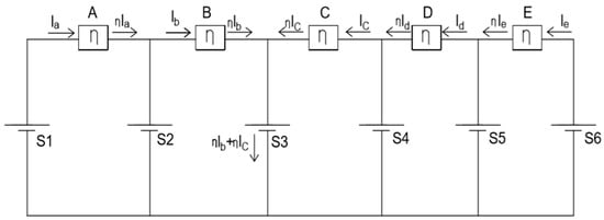 Figure 6 is an equivalent circuit showing the equalization (or driver) currents, Ia, Ib and Ic, between the sections, S1–S4, and the AEQ drivers, A to C. Because of losses, the current exiting each driver is reduced by an efficiency factor, η, e.g., the average current into A = Ia and the average current out of A = η × Ia. This can be seen from the inductor current waveforms in